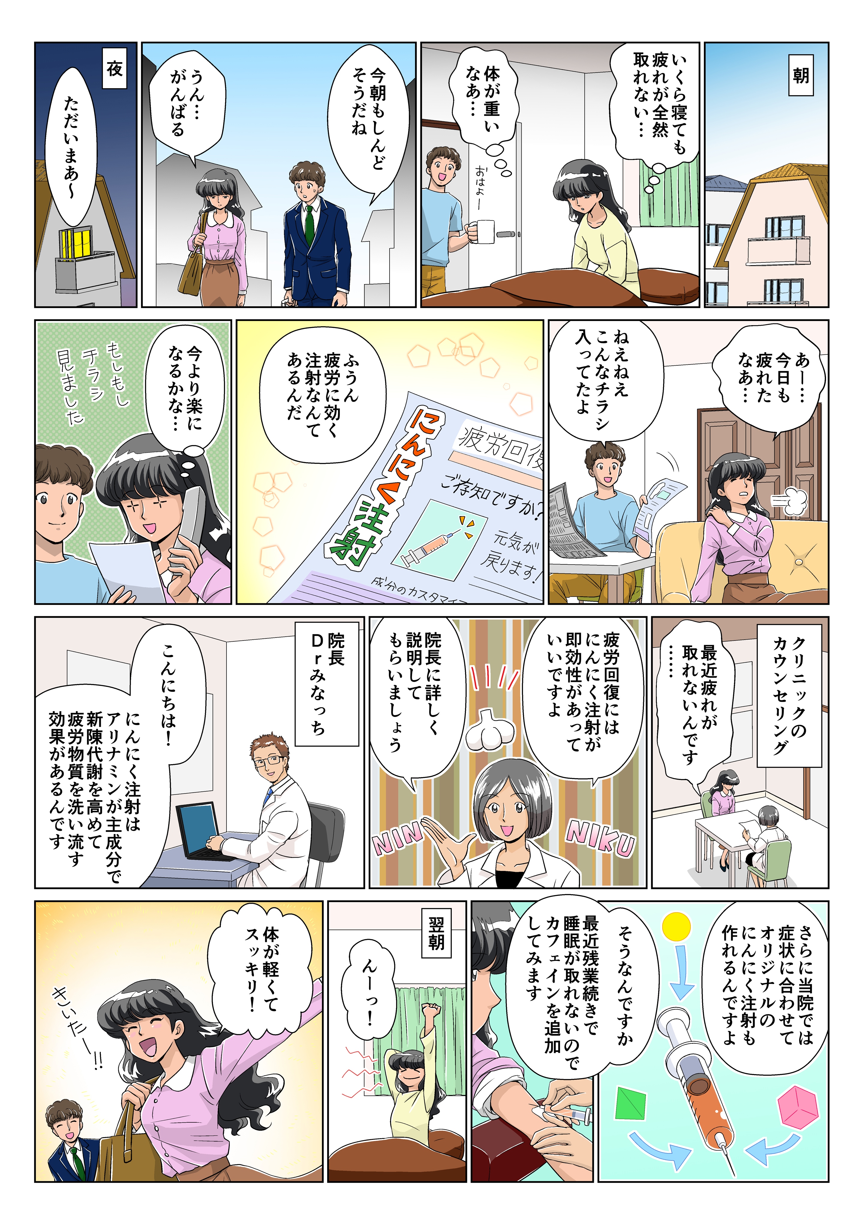 にんにくは、細胞を活性化し疲労回復効果に重要なアリナミンが主成分です。注射1本に、にんにく50個分の成分が含まれています。にんにく注射は血液に乗ってまんべんなく全身にアリナミンを行き渡らせ、疲労物質である乳酸を燃やしてくれます。